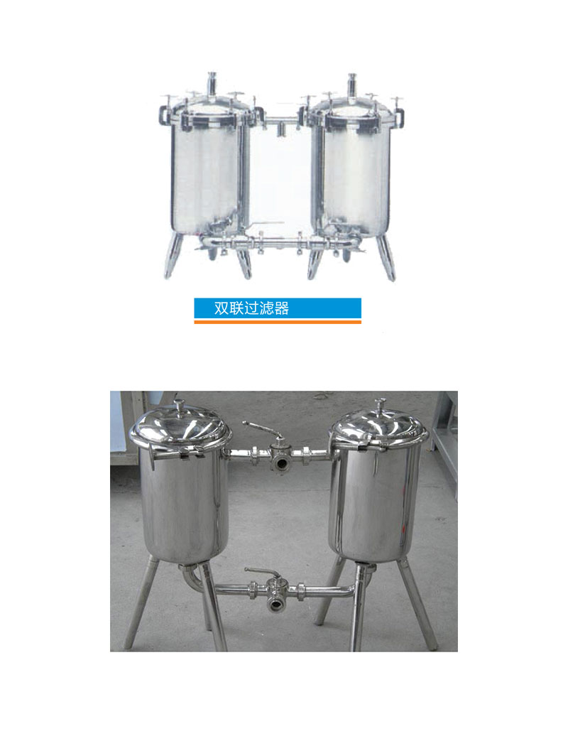 雙聯式過濾器全部采用SUA304優質不銹鋼制造,是二只圓柱體組成,內外表面拋光0.4μm,頂部裝有壓力表、排氣閥,適用于除去鮮奶、糖液、飲料、口服液等液體中各種肉眼看不見的固體雜質的凈化。兩只過濾器交替適用,可在不停機的情況下更換過濾網,適于長期連續生產。